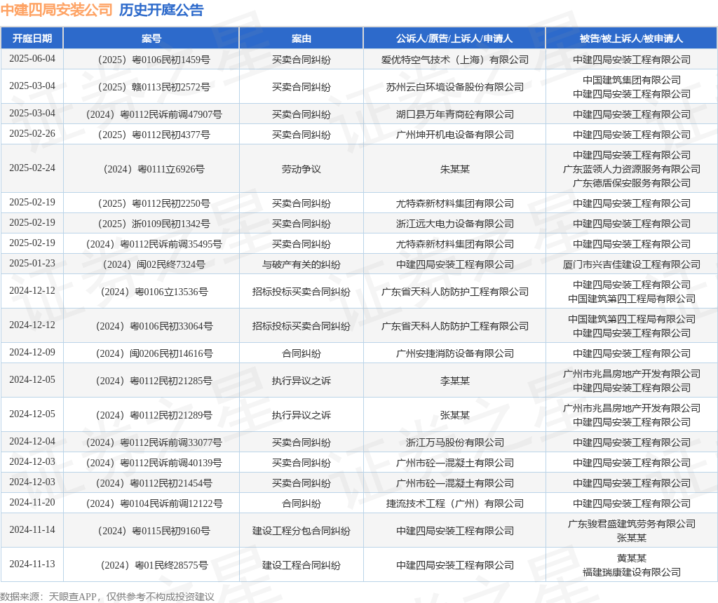 本站消息,根据天眼查APP显示,近日公布了一则中建四局安装工程有限公司作为被告/被上诉人的开庭公告,详细内容如下: